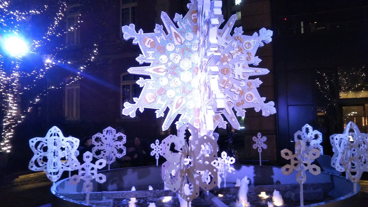 いつも夜なので中庭のイルミネーションが美しく、仕事帰りの人たちが食事をしたり買い物したり、時期的に並木道のイルミネーションが夢の世界のようです。