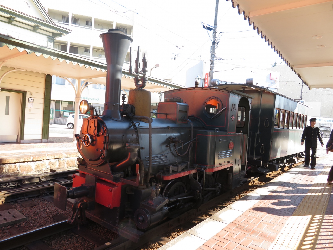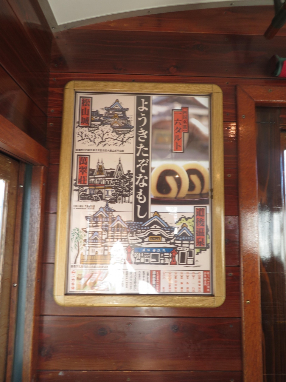 土曜日でしたが、意外と乗る人は少なく、途中からご夫婦が一組、若いカップルが一組乗ってきただけでした。案内をマイクも使わず、声を上げて車掌さんが説明してくれるばかりでなく、乗車してるところを記念にと、シャッターも押してくれるサービスの良さ、道後温泉駅まで楽しめます。