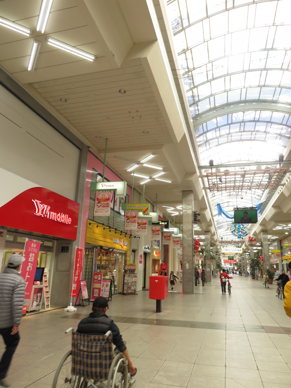 松山市駅前にはこれといったお店はなく、ショッピング、食事にはここに来る市民が多いようです。アーケード街で歩道はかなり広いです。