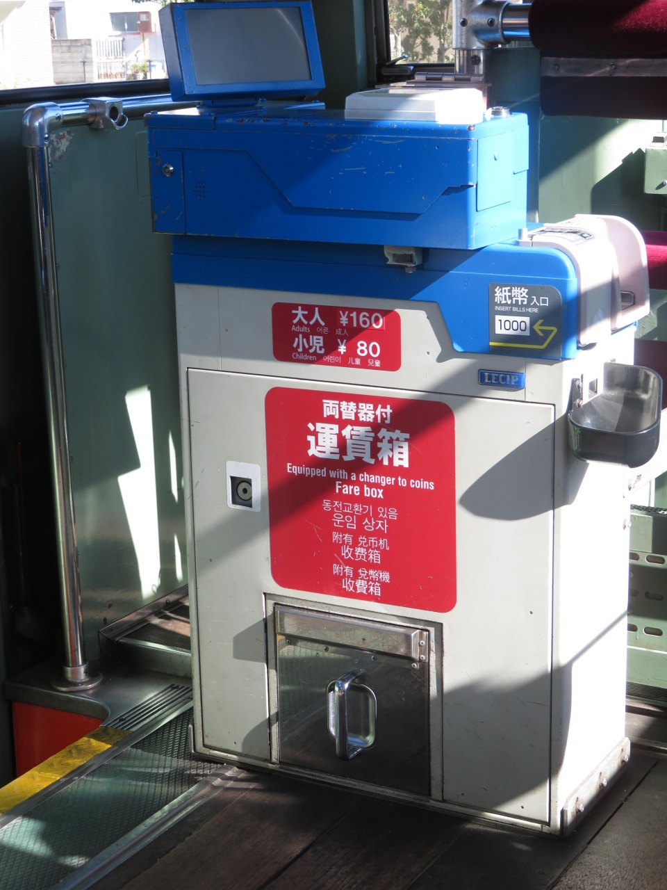 鮮やかなオレンジ色・みかん色?の車体の路面電車は松山の観光に欠かせない移動手段、一律160円なので、支払いは解りやすいです。