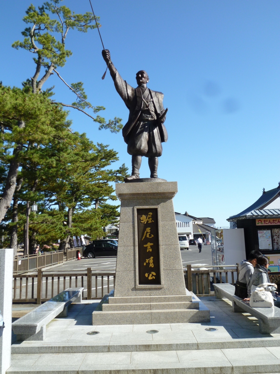 松江城完成400年にあたり銅像建築の機運が高まり、約4130万円は市民をはじめ、全国からの寄付でまかなったそうです。台座を含めて約6m、夜にはライトアップされ、台座の両脇には石のベンチがあります。写真を撮るにはちょっとですね。「松江開府の祖」天守閣に向かって凛々しくカッコいいです。