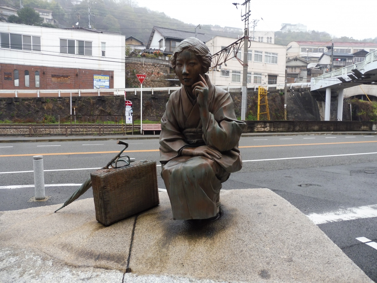 JR尾道駅から尾道本通り商店街の方に進むと左側すぐの場所にこの林芙美子像が有ります。