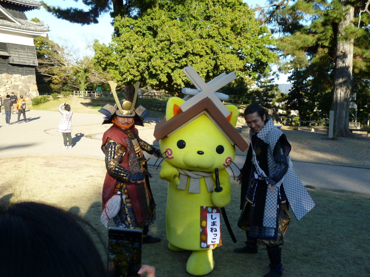城入口には武将をイメージした人が立っています。天守前にはちょうど「しまねっこ」がその武将らしき人達とサービスをしていました。天守閣は黒が主体でそれが重々しくてかっこいいです。古いしゃちほこや井戸、天守最大柱、最上階には国宝指定書もあります。