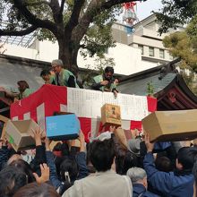 境内でお焚き上げが行われたあと、やぐらからみかんが撒かれます。