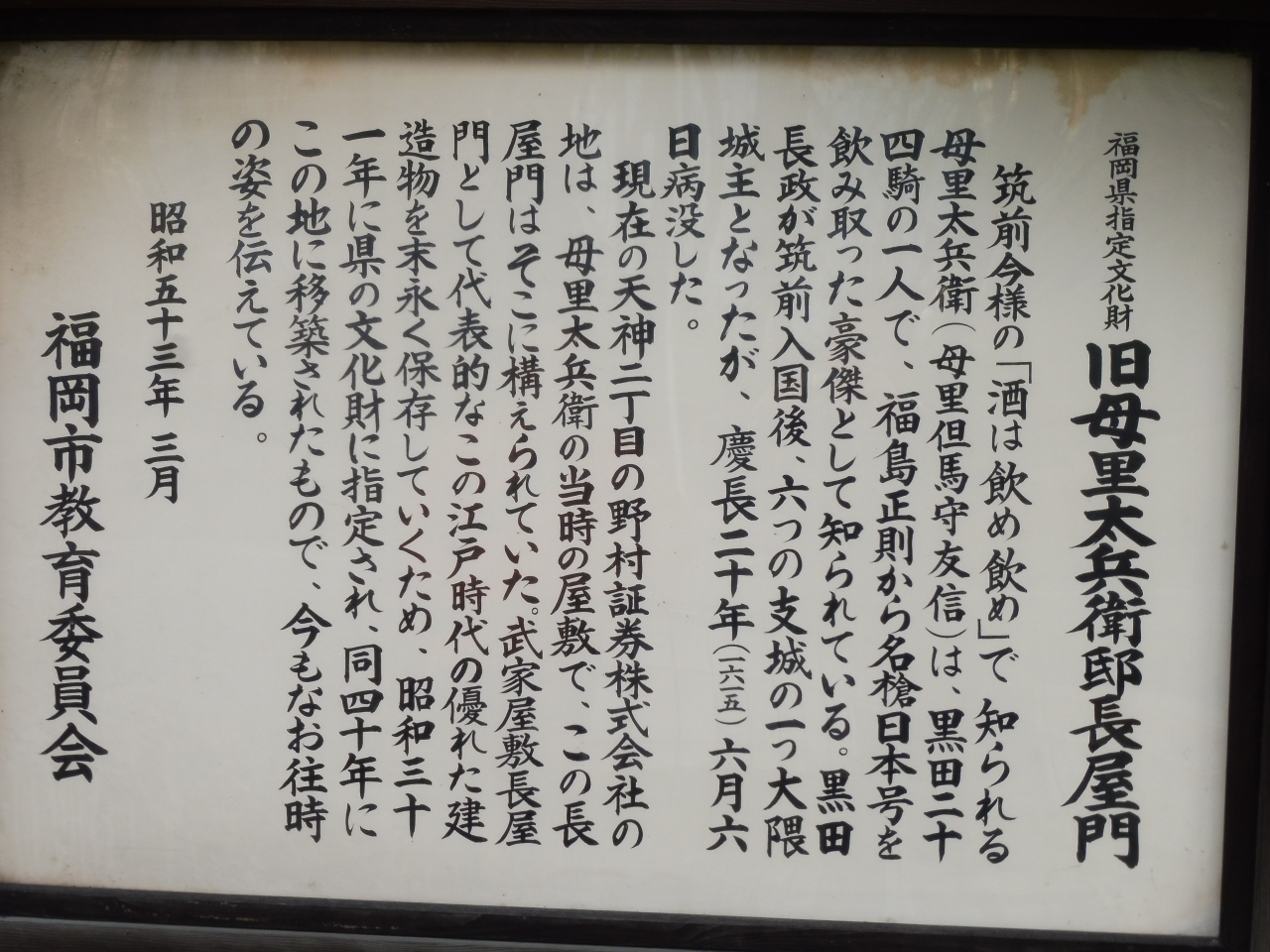 でも屋敷の長屋門が福岡城跡に移築されてますのでぜひ見学して加藤清正から飲み取った日本号という長槍のエピソードを思い起こしてみてください。