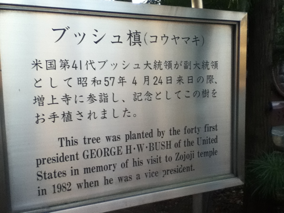 ブッシュ槇は三解脱門から入って左側奥にある。お勧めの点は、昭和57年当時のアメリカ副大統領だったジョージ・H・W・ブッシュが来日した時、増上寺を訪れ記念に植樹したものであること、槇はまだ大きくないが順調に生育していることである。訪問時の感想は、植樹したブッシュ元大統領は昨年亡くなったが、彼が植樹した槇が増上寺にあることを初めて知り、また植樹され元気に生きている槇を見ることができ訪問して良かった。