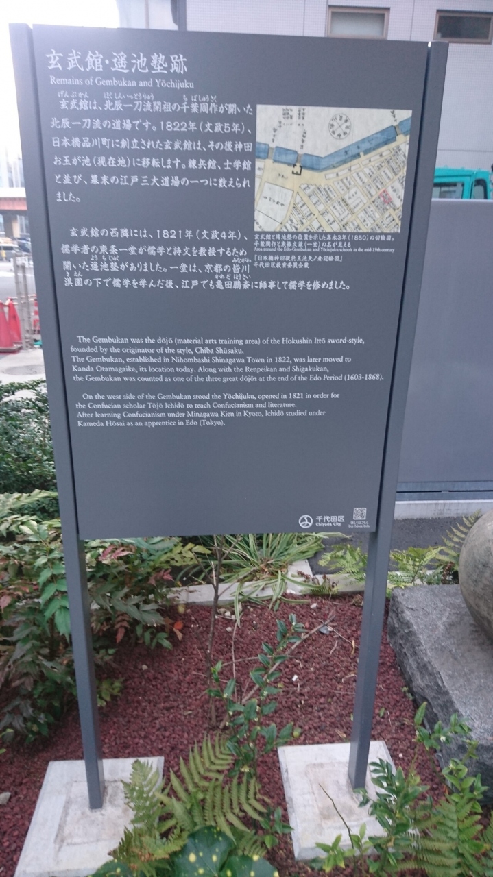都営新宿線岩本町駅を出て南西側にある一八通りを進むと駐車場のわきに立派な石碑がありました。しばらくこのあたりは工事中で見つかりませんでしたが、久しぶりに来てみると、意外と立派な石碑で驚きました。千葉周作は北辰一刀流の開祖で、この玄武館は江戸三大道場とも言われています。坂本竜馬らも学んだ歴史を持ち、あらためて歴史を感じました。