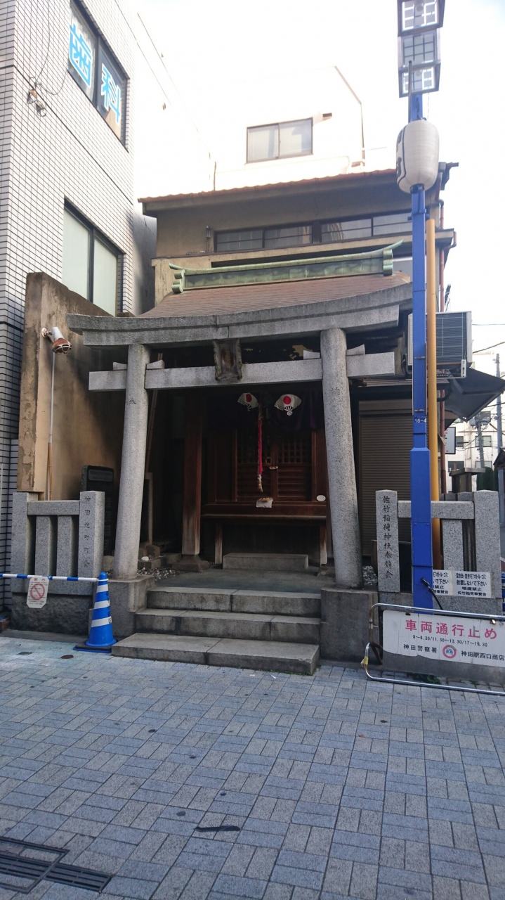 JR神田駅の西側、建物が並ぶ一角に小さな神社がありました。鳥居と社があるだけの小さな神社ですが、角地にあるので目立っていました。当地に江戸屋敷を構えた秋田藩佐竹氏が、藩邸の鬼門除けのため、1635年に邸内社として創建したそうです