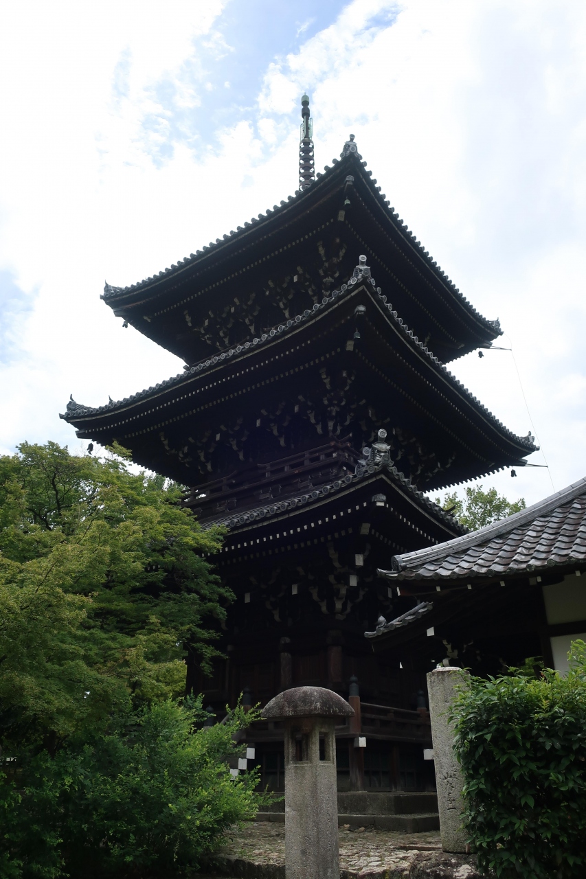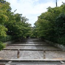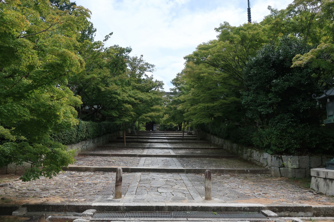 金戒光明寺から北に200m程行った所に真如堂があります。参道の石畳の両サイドのにはカエデが繁り、その奥に三重塔が見え、林の中に本堂がある様に見えます。真如堂は紅葉の真如堂と言われ紅葉の時期は大変人気のある場所ですが、青紅葉も良いものです。