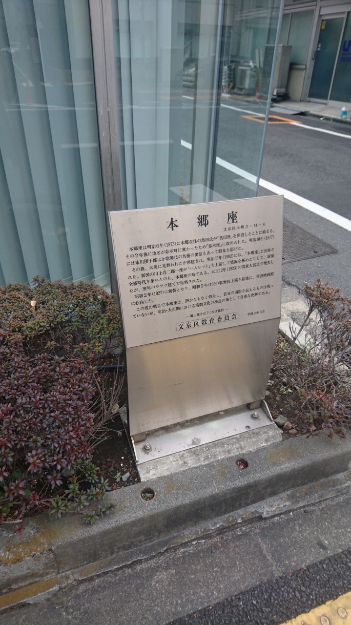 地下鉄本郷三丁目駅から南に徒歩10分ほど歩いたところに、かつて盛況を博した本郷座があったそうです。今ではビルの敷地の一角に説明板が設置されているだけですが、1873年に開設された奥田座が発祥です。戦災で跡形もなくなりましたが、歴史を偲ばせる説明板に地域の人々の思いを感じました。