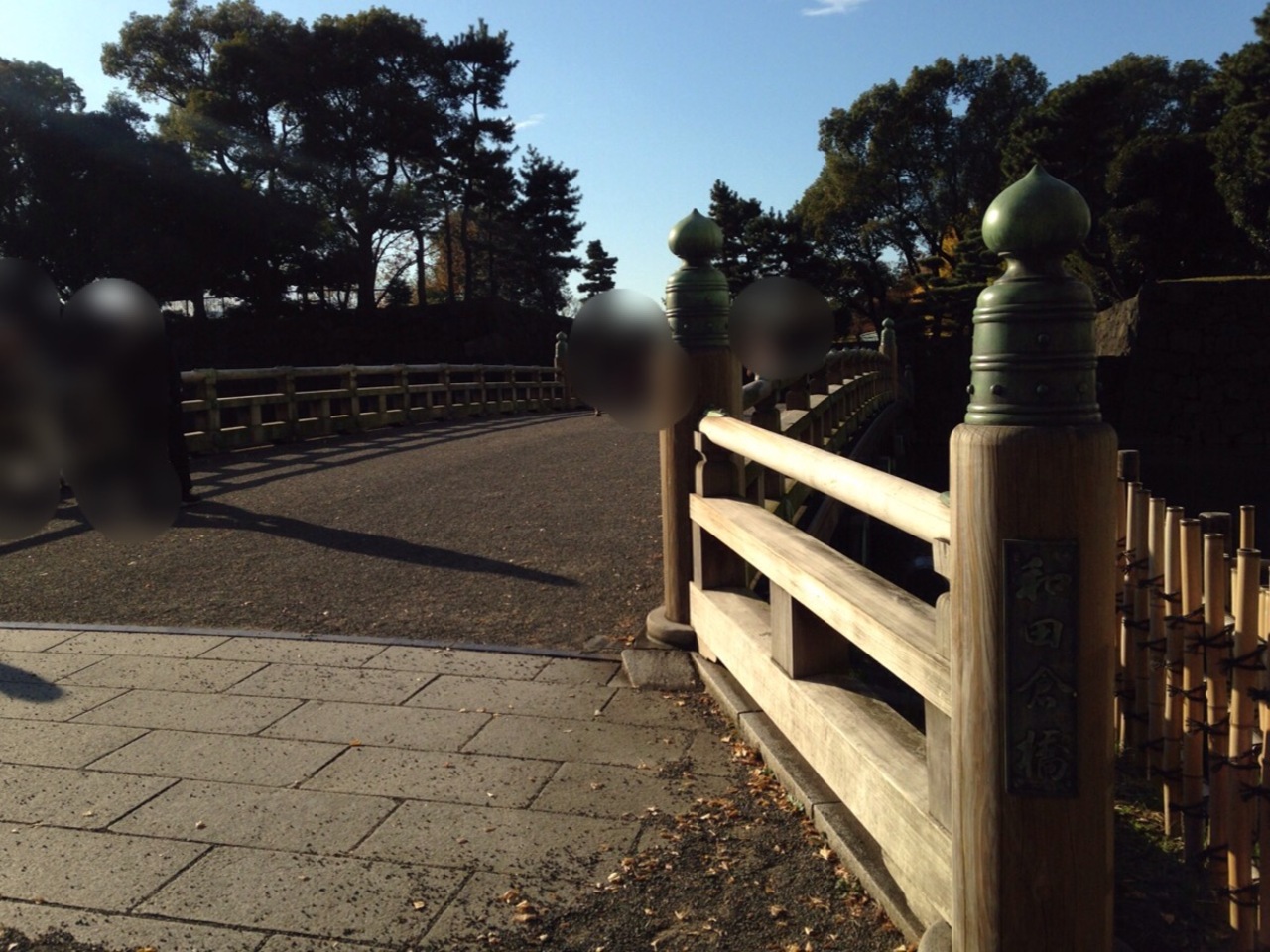 日比谷通りからこの橋を渡ると和田倉門跡の大きな石垣があり、さらに和田倉噴水公園に出られます。なので誰でも気軽に渡れる橋で穏やかなお堀の水面も充分に眺められます。木製っぽいですが近年に改修されたコンクリート製の橋だそうです。それでも擬宝珠が沢山付いていてとても雰囲気があります。
