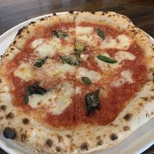 店内フロアには薪窯とガラス張りの調理スペースがありピッツアを作っているところを見ることができる。初めての店ではマルゲリータを食べることにしており注文。薄くモチモチの生地に酸味の効いた美味しいトマトソース。味はいいですが値段はやや高めに感じる。
