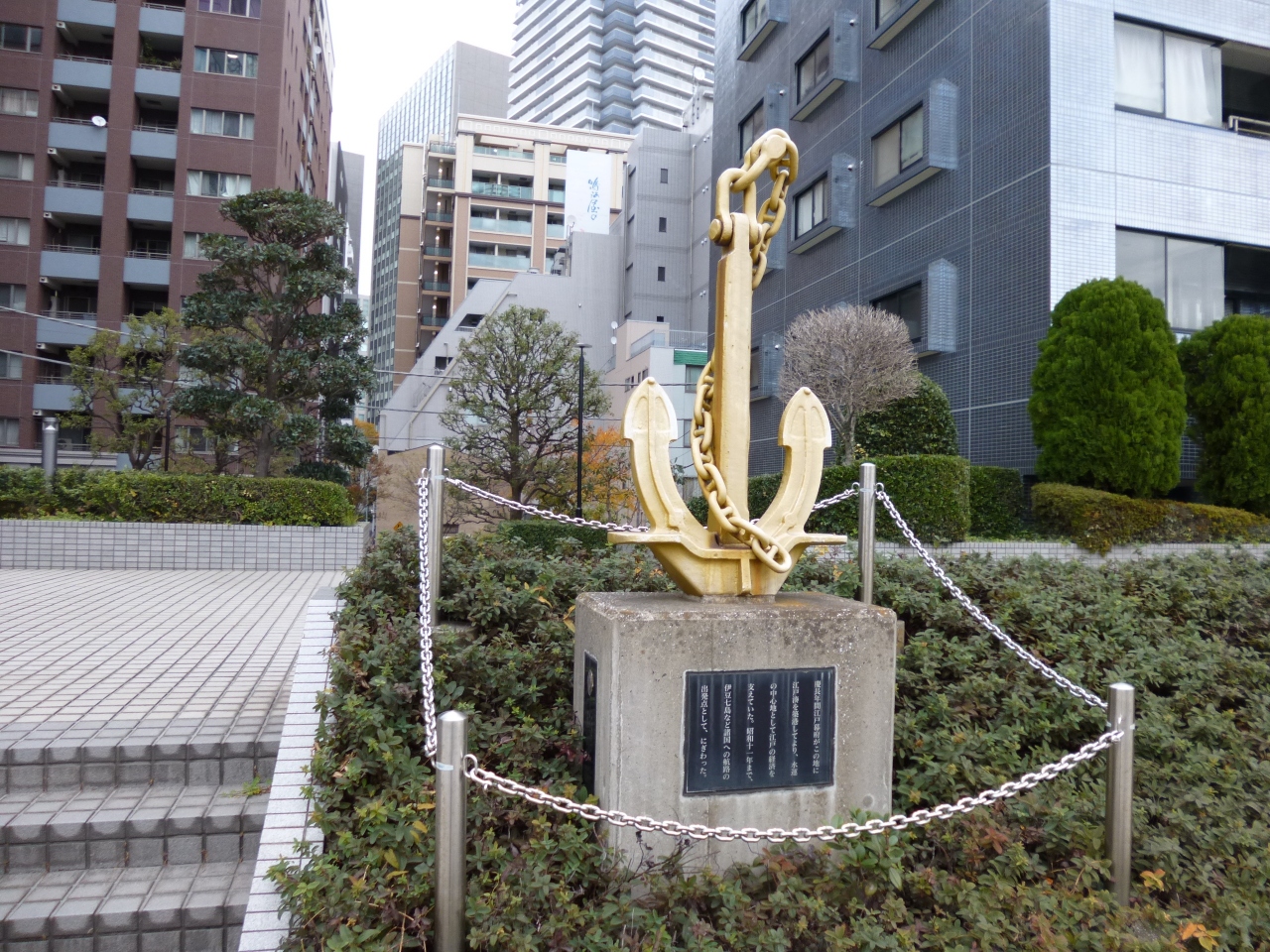 八丁堀方面から南高橋を渡って右に折れ、リバー通りを少し直進し、階段を降りて隅田川テラスに出るとすぐに目に入ります。石碑の上に金色の錨がのっており、見た目にも分かりやすい、フォトジェニックな史跡です。目の前には亀島川と隅田川の合流地点があり、素晴らしい景色です。