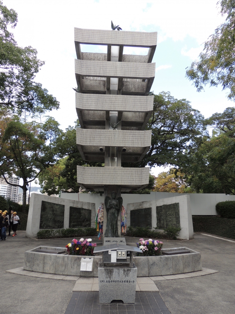 第二次大戦中労働力不足を補うため、勤労奉仕に動員され戦禍に倒れた学徒と、原爆の犠牲者を含めた学徒の霊を慰めるために建立されたそうです。平和の女神像と八羽のハトを配した高さ12mの有田焼の陶板仕上げで末広がりの5層の塔の中心柱に慰霊の灯明がついています。