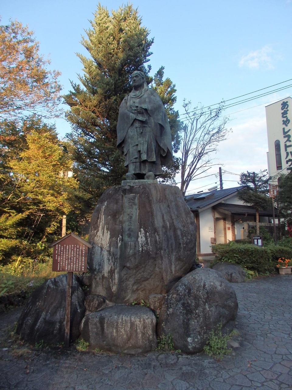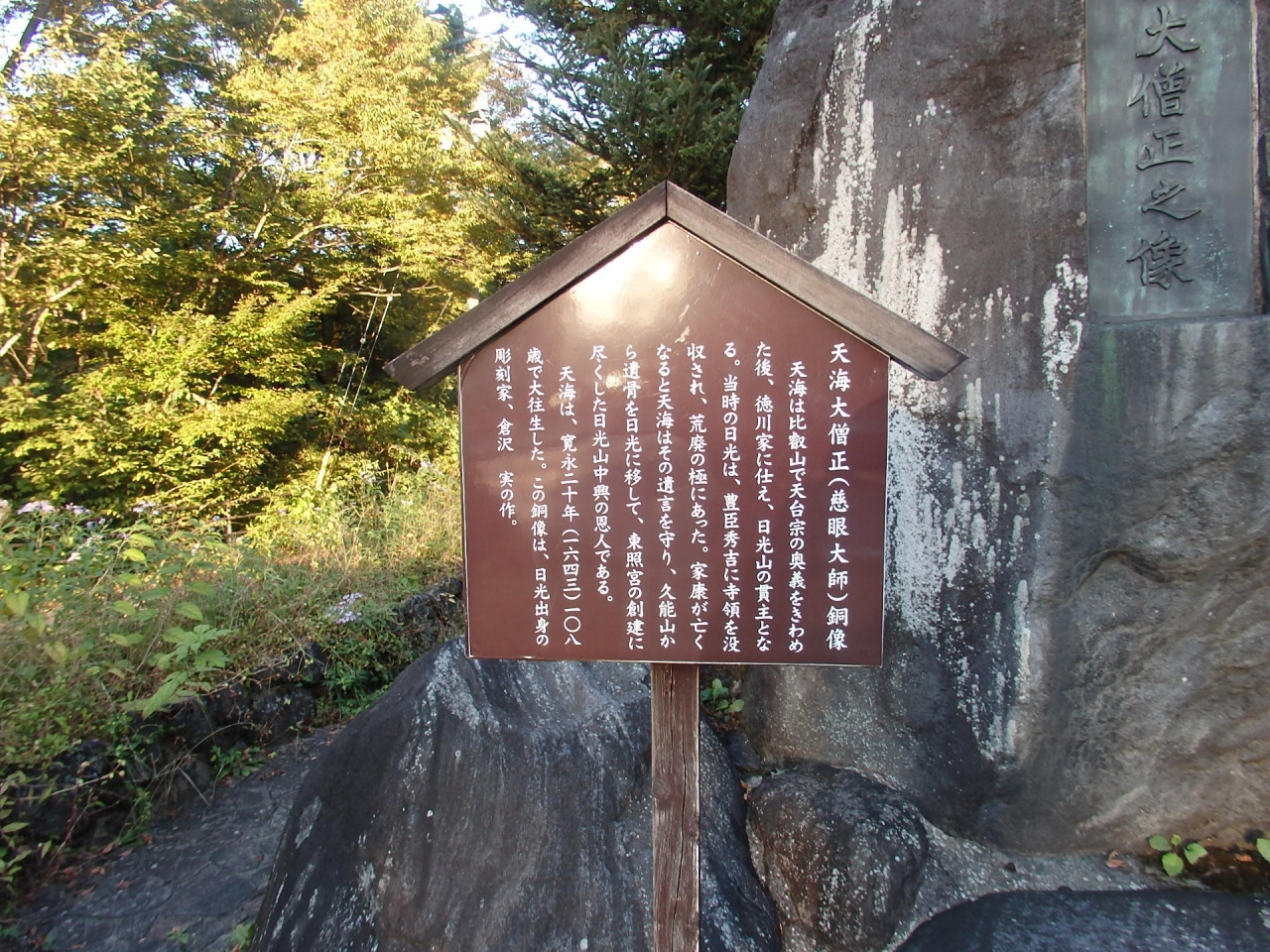 天海大僧正の像は神橋付近の日光駅側に建つ銅像です。天海大僧正は輪王寺の第五十三代貫主で徳川家康・秀忠・家光の三代に仕え、家庭教師、宗教政策、朝廷政策、政治・経済政策に深く関わりました。日光山を再興した僧侶です。家康死後、東照宮造営を差配されています。黒衣の宰相と言われるだけあって、威厳のあるお顔をしておられます