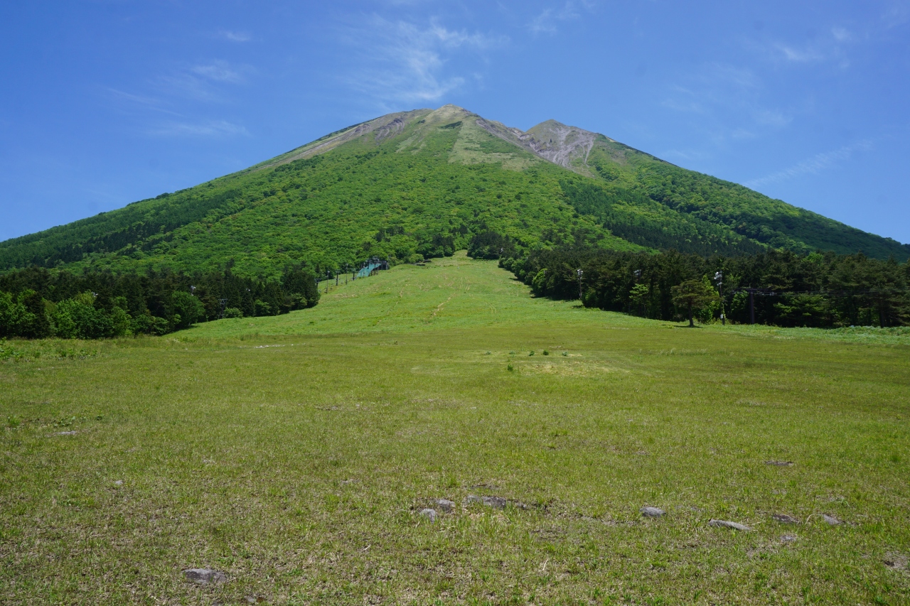 桝水高原は、大山の西側。蒜山高原に向かう途中にある芝生の山すそ。冬場はスキー場ですが、春夏は、芝生の緑がきれい。なだらかな傾斜なので、小さな子供でもここなら安全に遊べます。背景の大山も格好がいいし、遠景は長く伸びる弓ヶ浜。大山を代表する観光ポイントの一つだと思います。