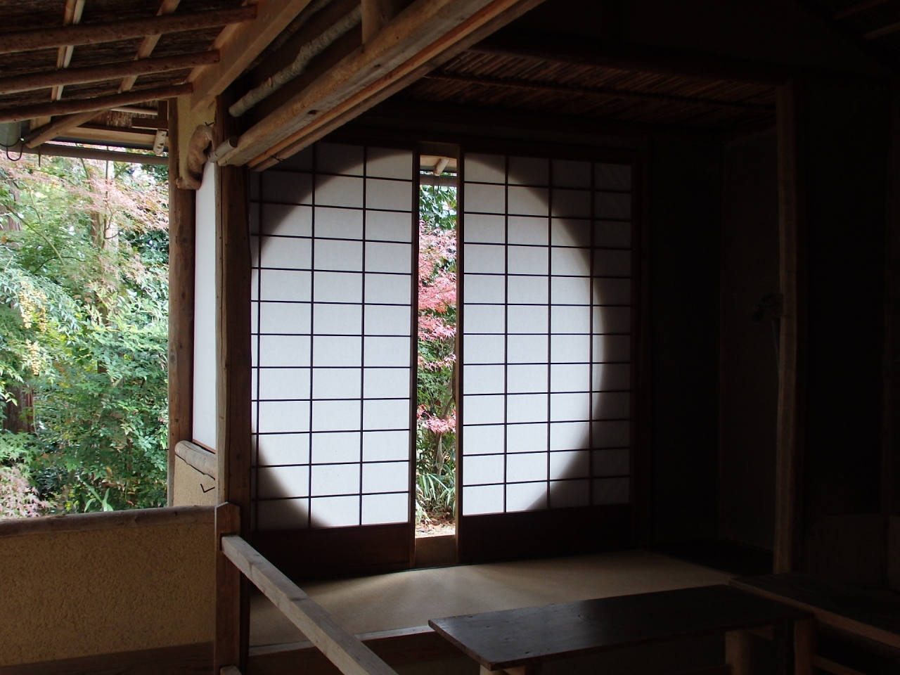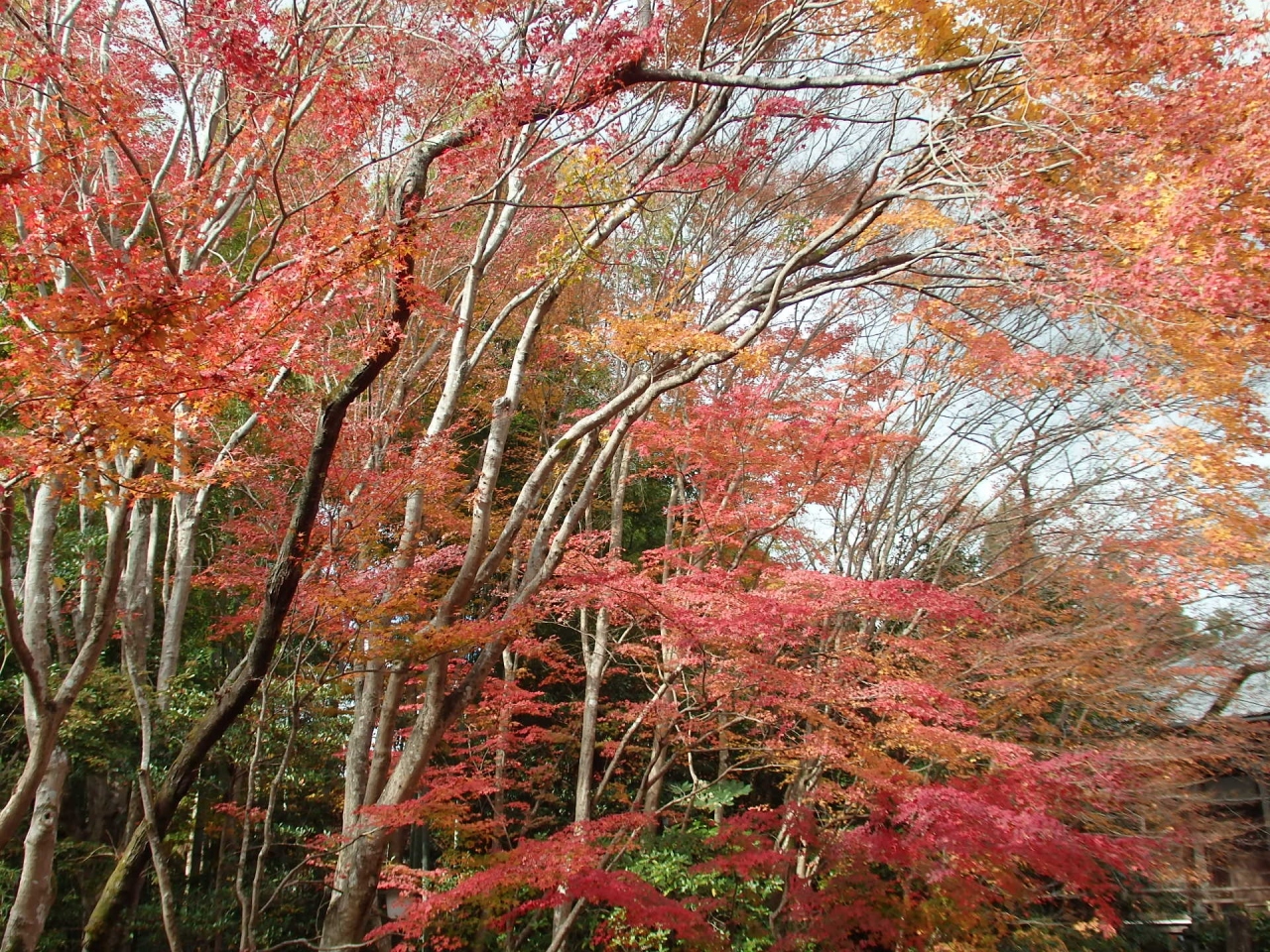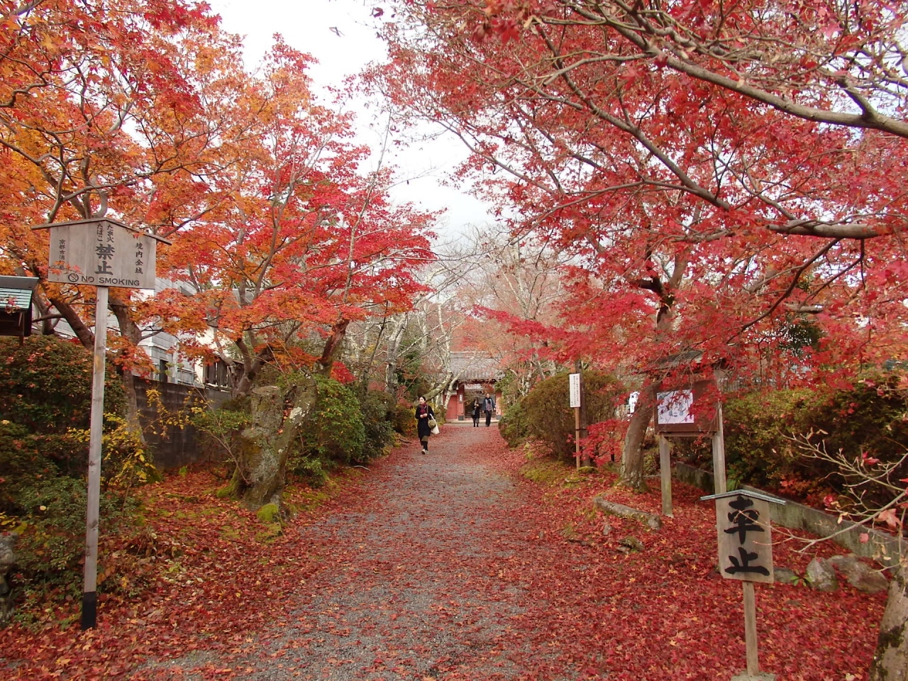 開山の日乾上人に帰依した才色兼備の名妓二代目吉野太夫が寄進した赤門(山門)、本堂、茶室遺芳庵、帯塚、開山廟など見所が多くあります。茶室遺芳庵の丸窓にある障子を少しけて見る紅葉は趣があります。奥には吉野太夫と夫の豪商灰屋紹益の墓があります。境内、参道とも紅葉は散り始めていますが、まだ十分見るに値する見事な紅葉で、私推薦の京都紅葉名所寺院十五選に入れたいほどでした。京都駅の大混雑ぶりから、鷹峯も多くの観光客を想像していましたが、意外にもしょうざん庭園以外には各寺数人以下の拝観客しかいませんでした。意外と穴場なのかもしれません