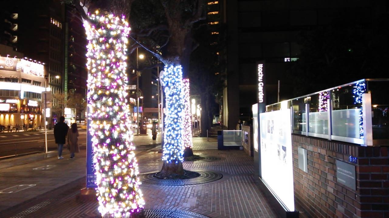 (街路樹の幹に色とりどりのLEDが巻きつけられてました)