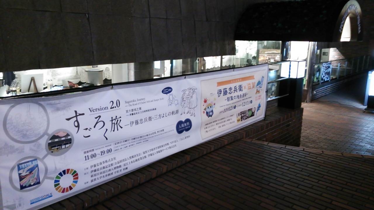 この日は「すごろく旅-伊藤忠兵衛・三方よしの軌跡」というイベント中で、江戸時代の近江商人の行商から始まった伊藤忠商事の歴史や商売哲学を紹介しているほか、笠と道中合羽を着て写真の撮れるフォトスポットや、近江ということで滋賀名物を集めた販売コーナーもあったりと気軽に楽しめる雰囲気でよかったです。