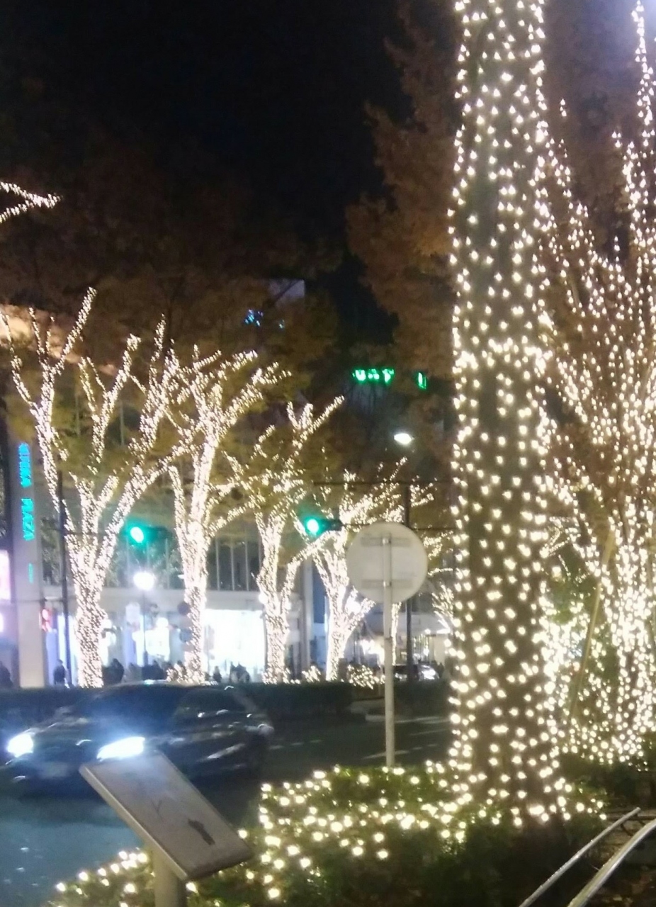 通りかかった表参道でケヤキ並木のイルミネーションを見ることができました。ケヤキだけでなく、間の灌木にまでLEDが付けてあり、一面キラキラした雰囲気を楽しめます。