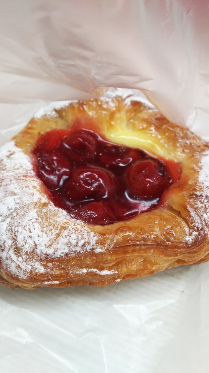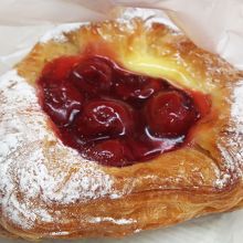 甘いパン、しょっぱいパンいろいろありましたが、おやつがわりにチェリーのパンを購入しました。パイ生地がさくさくしてて中央にはチェリーを甘く煮たものとカスタードクリームがたっぷりでした。カスタードクリームの甘さと甘酸っぱいチェリーのバランスがとても絶妙でした。