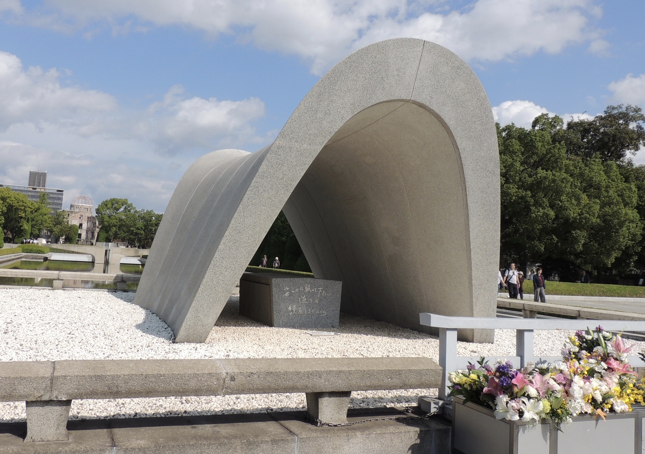 核兵器廃絶と恒久平和を願い灯された平和の火です。反核のシンボルとして、核兵器がこの地球から完全になくなるまで絶対に消されることなく燃え続ける祈りの灯りです。原爆死没者慰霊碑のすぐ近くにあります。台座は手首を合わせて手のひらを大空に広げた形を現しているそうです。