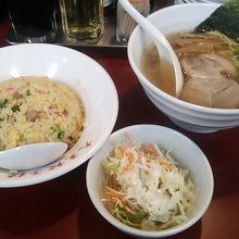 ミニ炒飯・ミニ焼肉丼・ミニ麻婆丼・ミニ天津丼のいずれか1品と塩・醤油・豚骨のいずれかのラーメン1杯、そしてミニサラダが付くという内容でした。