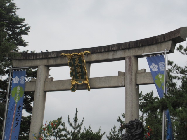 京都の北野天満宮に参拝に行きましたが、その天満宮の入り口にあるのがこの鳥居です。一の鳥居はとても大きな石造りのもので迫力あり。(となりの狛犬も迫力あり)天満宮と書かれた額があざやかで目立っていました。その奥にも鳥居はあって、全部で3つです。鳥居をくぐると楼門になり、本殿へつながります。
