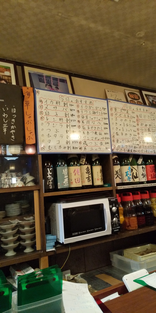 がカウンターで接客。八戸の海のもの山のものを出す渋いいざかやで酒場の雰囲気がとても良い。魚はやはり一番にうまい。できれば禁煙ならもっと良いのだが。