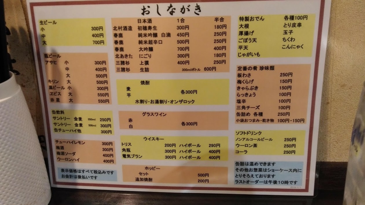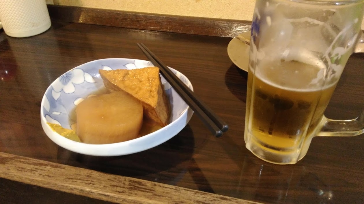 JR奈良駅近くでサクッと飲める店が何軒かありますが、ここは15時からと一番早い開業時間の昔からの立ち飲み店です。冷蔵庫につまみがいろいろあり、必要なものは電子レンジで温めてくれます。おでんは一品100円でお手軽です。