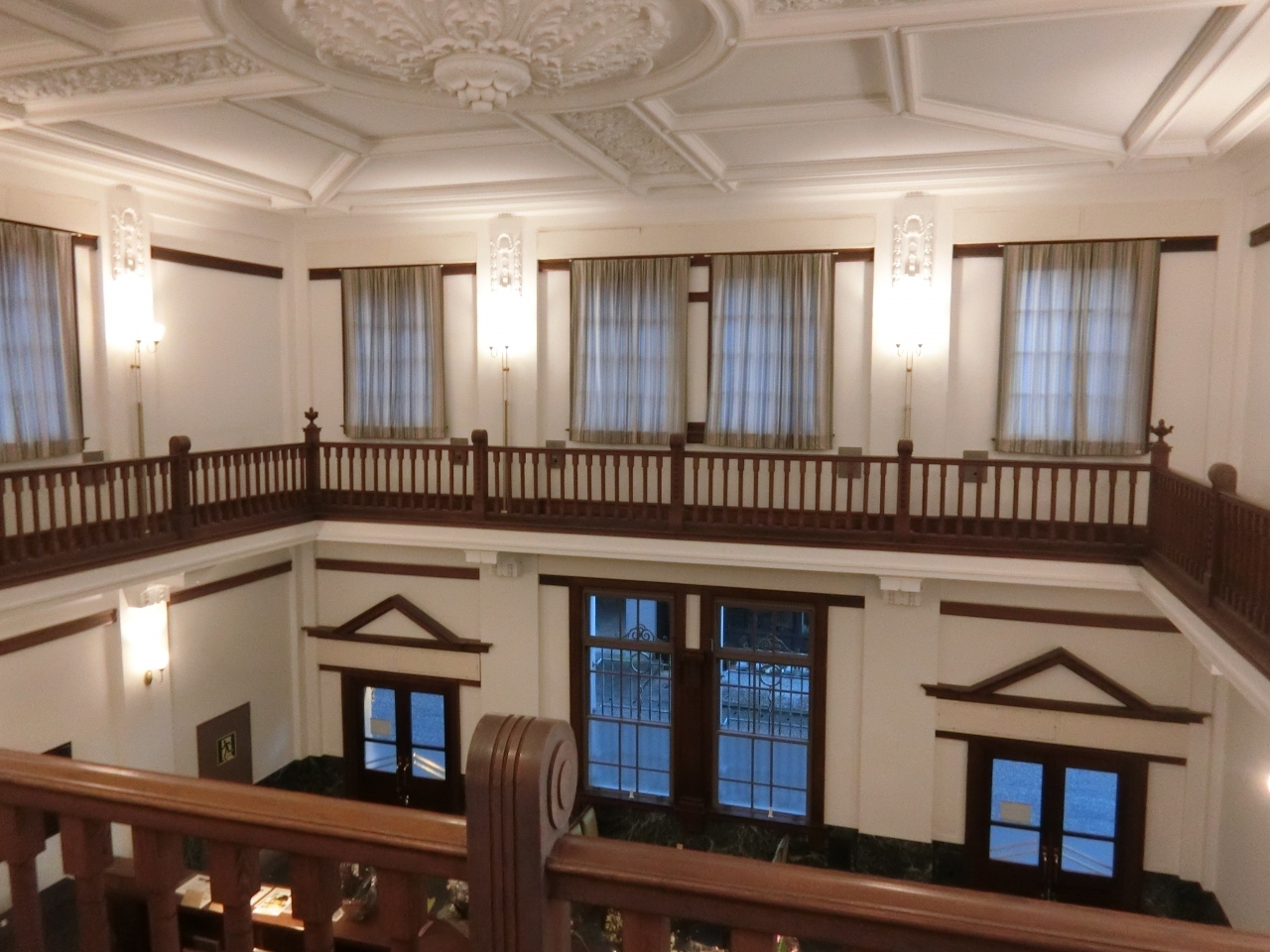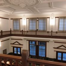 大正時代に建てられ、昭和46年まで銀行として営業していました。県内最古の鉄筋コンクリート造りで有形文化財になっています。中に入ると吹き抜けで天井高。壁は漆喰の白壁で天井の模様などが素敵です。会議室や応接間などがあり、係の人に1つ1つ説明してもらえました。