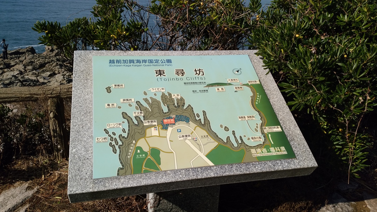 OT9ではじめて東尋坊へ芦原温泉駅からバスで行ってみました。有名観光地だけあって内外の旅行者で一杯でした。バス停から徒歩で約10分で岩場の上にでれます。気象状況で遊覧船が出るそうでしたがこの日はお休みでした。夕日はきっと美しいと思います。小松空港に着陸する航空機が上空を飛んでゆきます。おトイレの場所を探すのに難儀しました。笑