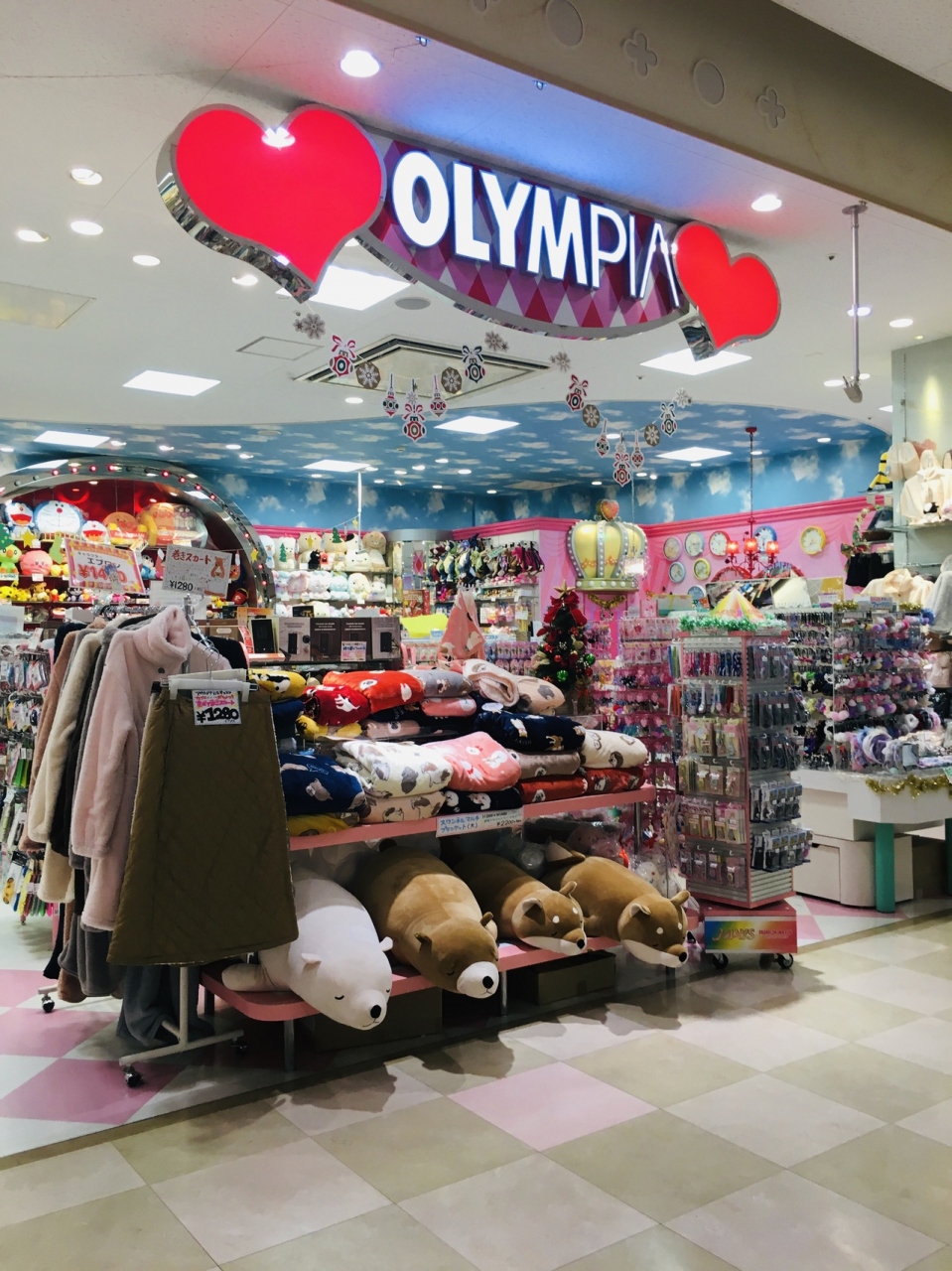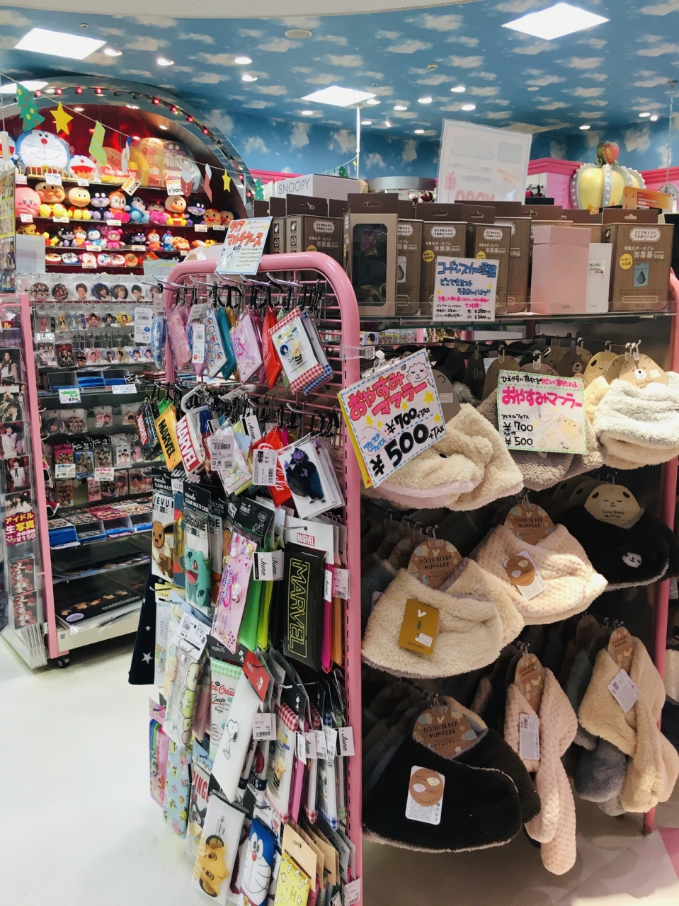 大きなぬいぐるみが売っていて可愛らいアザラシでした。子供向けの店で、冬に訪れたせいか、毛糸の品が目立ちました。アイドルのプロマイドのようなものもたくさん陳列されていて、どちらかというと若い女性向けの店でした。