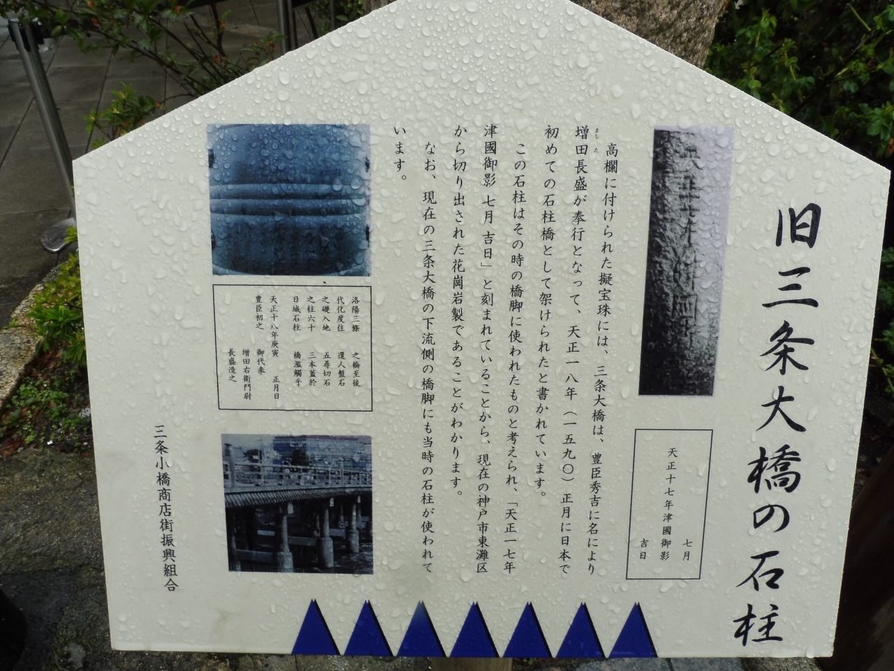 今回はそのお店の前に有る案内板に注目!豊臣秀吉が三条大橋を架け直させた時の石柱が保存されています。なんでも当時の神戸から運んできた石材だそうです。