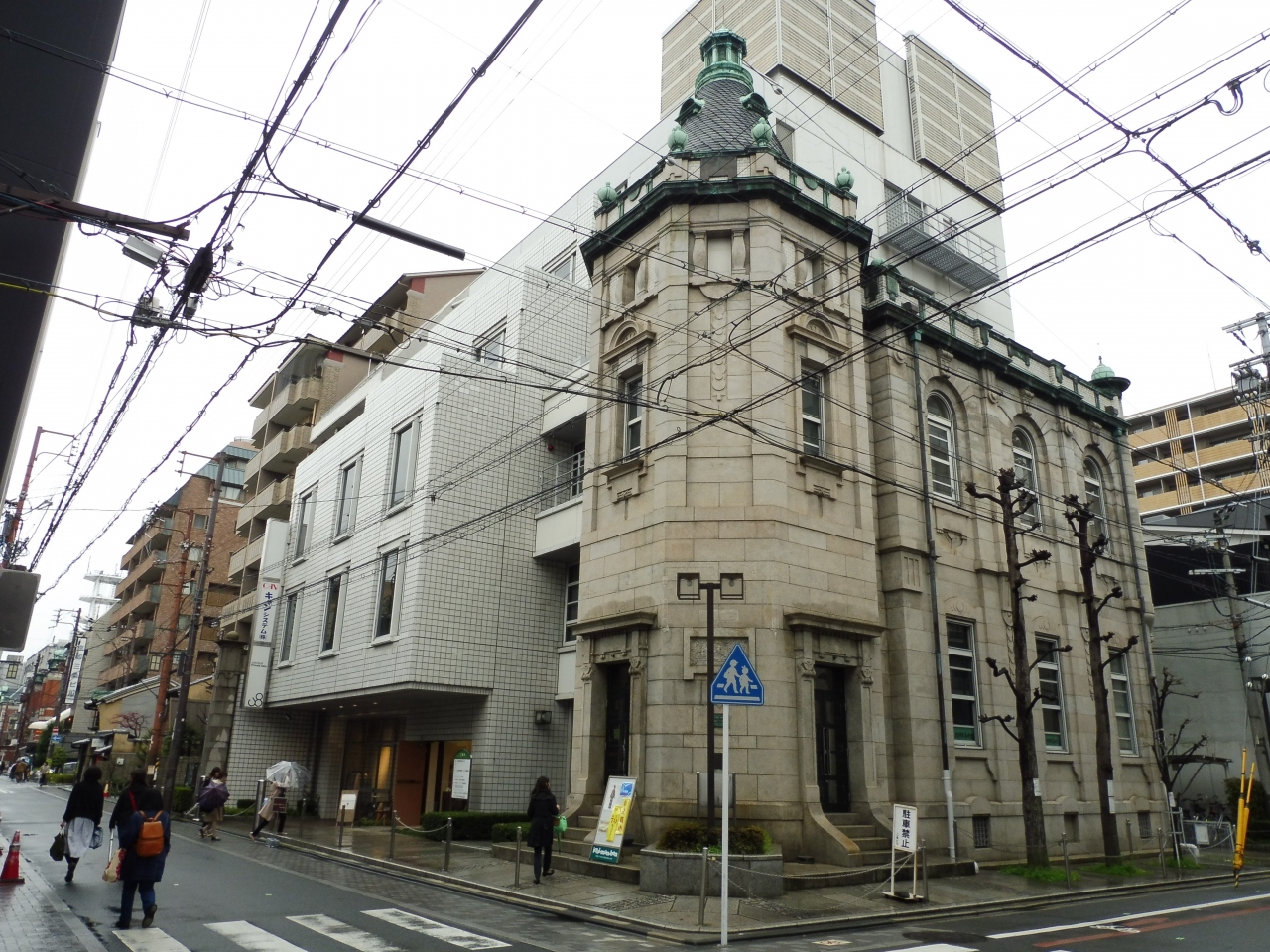 もとは日本生命の京都三条支店で昭和の終わり頃に柳馬場道りの角側の入り口と側面・尖塔を残して解体&改修されましたが部分保存されて良かったです。