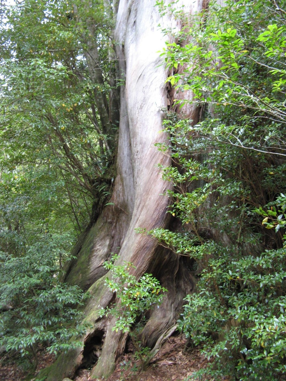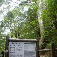 白谷雲水峡の弥生杉コース(約1時間、約2km)の中間あたりにあります。現地にある説明板によると、樹齢約3000年、樹高26.1m、胸高周囲8.1mの大木です。直接触れることができず残念でしたが、ナナカマドやサクラツツジなどいろいろな樹木を着生させた弥生杉は神々しい風格を醸し出していました。