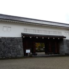 JR山形駅から徒歩10分くらいの距離にある山形城址の東側の門です。ここから入った理由はこの門の外側に大きな地下駐車場があったためです。1991年に復元された門で土塀と櫓を組み合せがとても重厚な造りの門です。この門に内濠とJR左沢線の切通しがあり、それぞれを跨ぐ橋が架けられていました。門の上に登って内部の見学も出来るようですが、早朝に訪問したために入れませんでした。