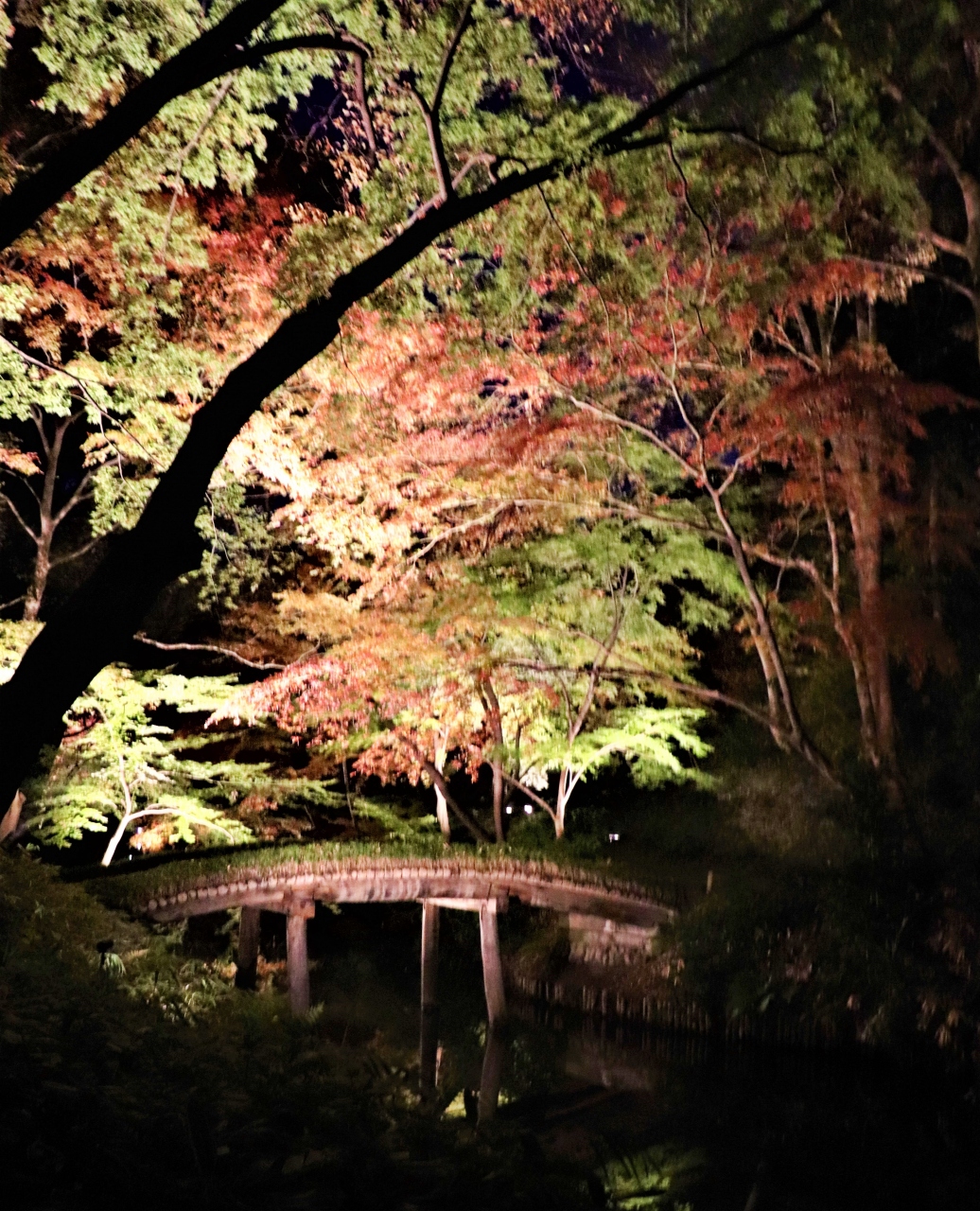 ライトアップされた夜は、闇の中に浮かび上がる苔むした橋が幽玄な雰囲気。