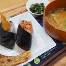 えび天と紅鮭のおにぎりと、豚汁と、漬物のセット。