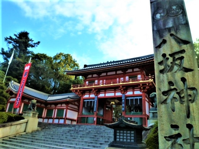 次の日には`東山区祇園町の八坂神社`から;ホテルは下京区河原町通五条なので市バス四条烏丸で乗り換えましたよ。最初はあの有名な[西楼門]がスタートです。四条通東端のT字路にありますが、西楼門全体を撮るのに交差点(青信号で!)から;8:30頃で団体さんがまだ到着前でした。格式のある神社で門(重要文化財)はご神木`杉の木`が周りを…`紅葉`は? 杞憂でした紅葉がそれぞれの<社>に,,♪