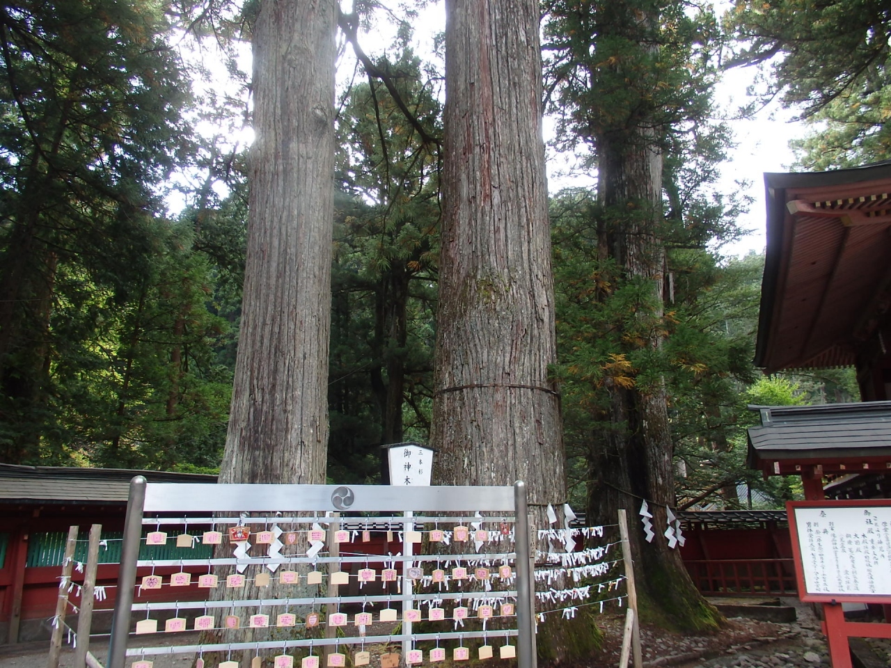 二荒山神社内にはこの御神木(三本杉)をはじめ、寄生木、この御神木の傍にある夫婦杉(夫婦円満)、神苑内にある御神木等大木の杉の御神木が多くみられ見ごたえがあります。寄生木は杉の大木に楢の木が寄生している縁結びの御神木です。「好き(杉)なら(楢)ばと一緒になりました」というだじゃれが説明版にありました。神々しく堂々としている姿に圧倒されます