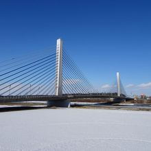 十勝川インフォメーション近くの展望エリアからの景色が見事です。青い空に白い鶴橋が映えて、大きな鳥のようです。十勝大橋の特徴、材料、施工、等々、十勝大橋の情報が記された立派なボードが設置されているので、是非、そこで見て欲しいです。