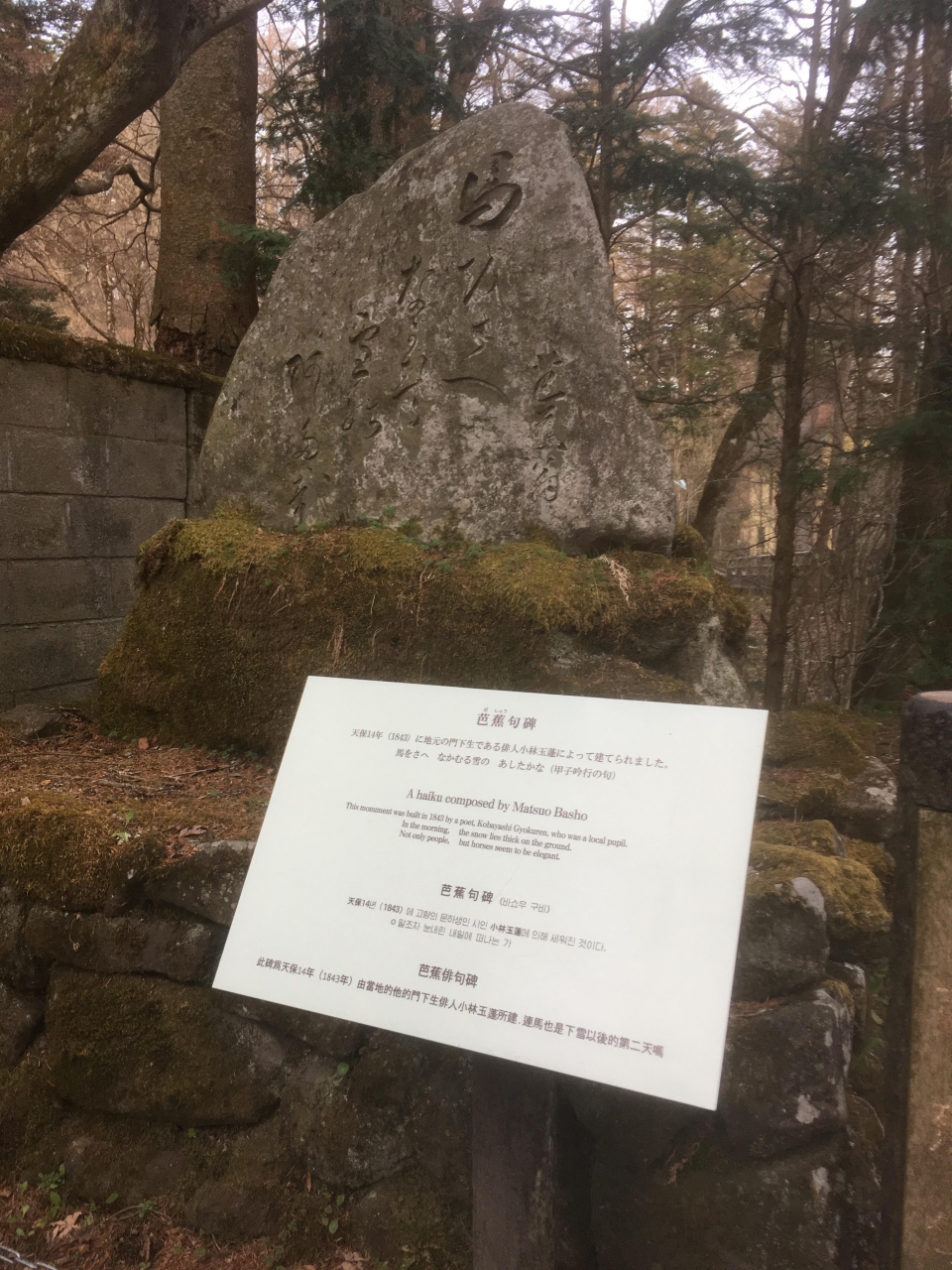 「馬をさえ ながむる雪の あしたかな」と刻まれています。この碑の良さを感じるのは、やはり軽井沢の凛とした空気を感じる時期ではないでしょうか。見慣れたはずの馬でさえも雪の中にいる風景は格別なものであるよ…芭蕉はそのように詠んだのでしょう。碓氷を越えて、ひんやりとした空気の中で出会った碑であるからこそ、芭蕉の句意が少しだけわかったような気がします。