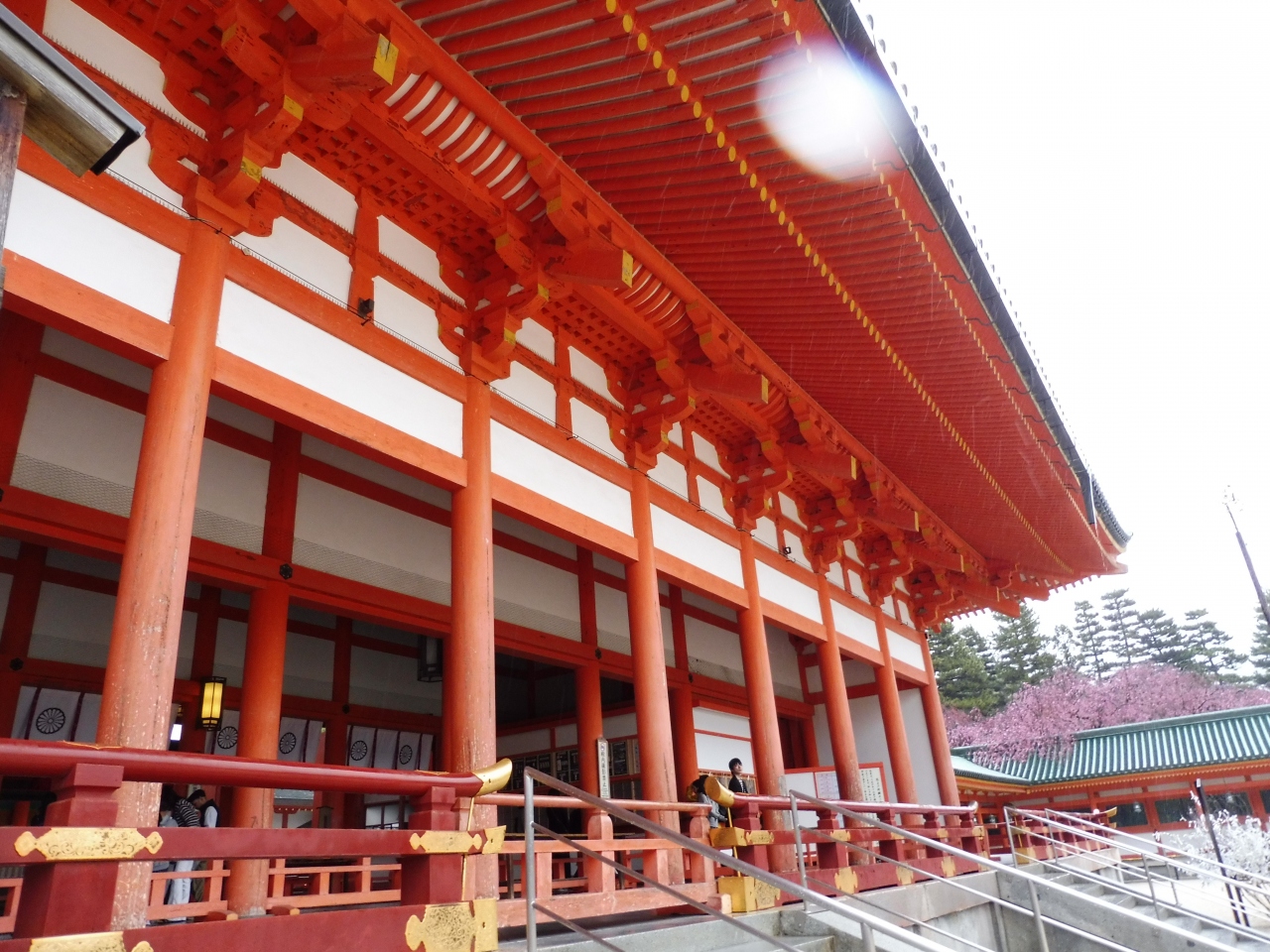 平安神宮の中心となる建物でここでお参りをします。この平安神宮 大極殿(外拝殿)は平安時代の内裏の朝堂院の大極殿を縮小復元したものです。
