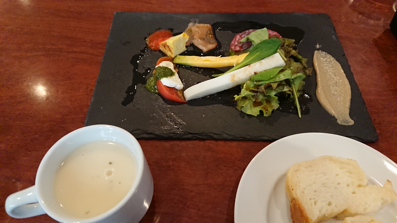ランチのメニューは色々あり、前菜とパスタかピザが選べるものにしました。