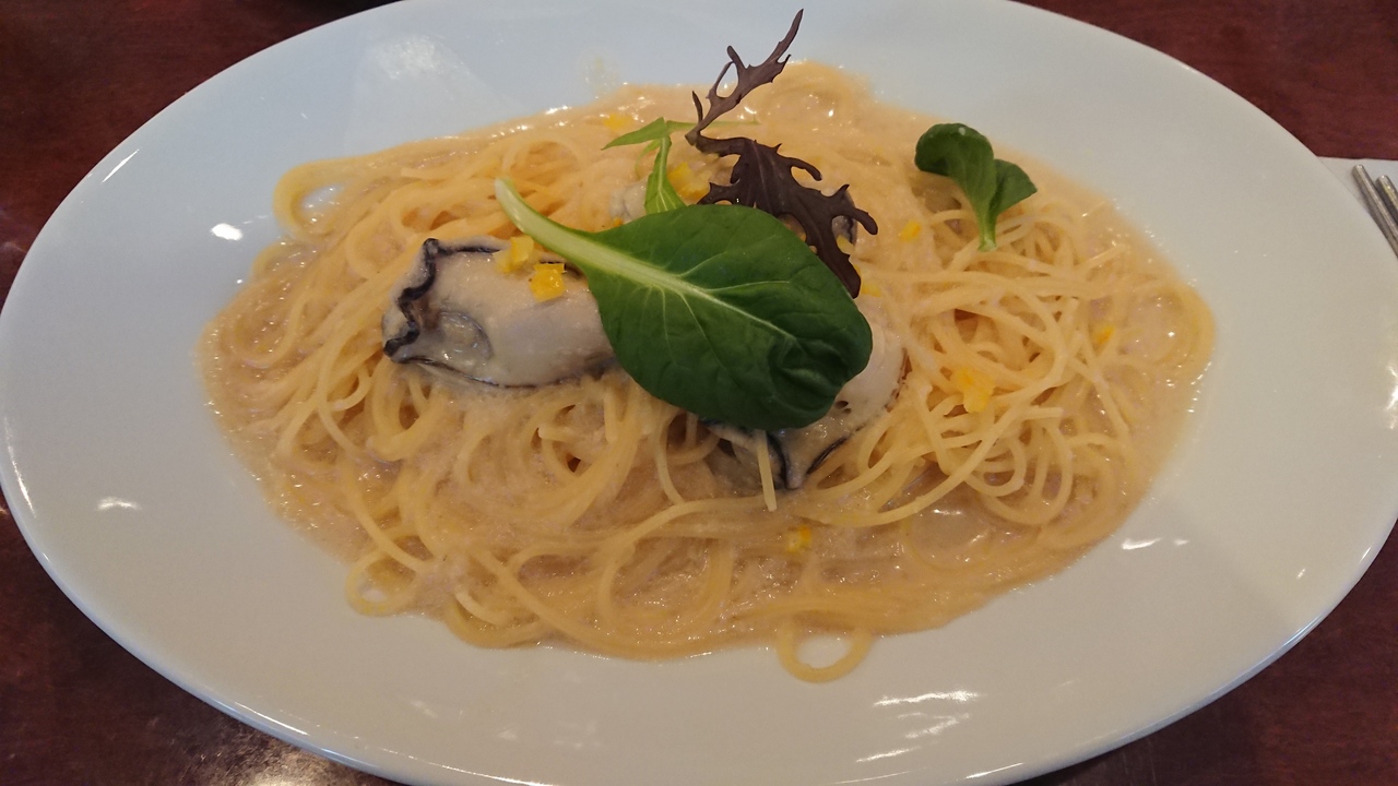 牡蠣の和風クリームパスタは大きな牡蠣が3つも入っていて、柚子の香りでさっぱり食べられる。