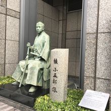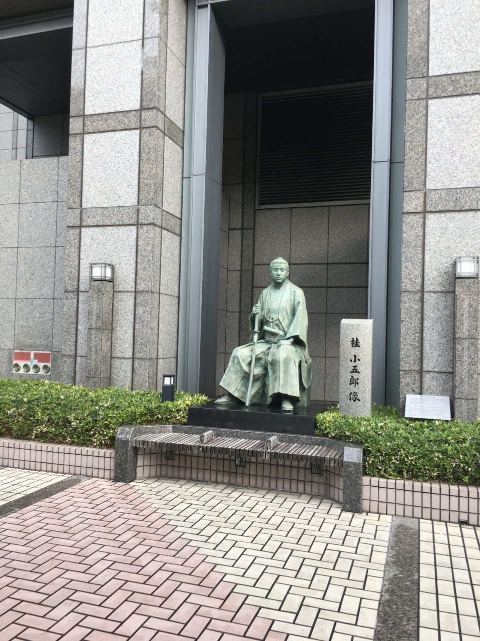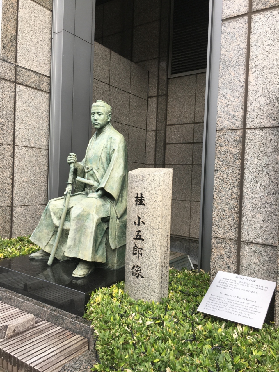 ホテルの前にあり、緑ぽい像で座っていて、刀を指した武士の姿で顔立ちはさやかな顔立ちでした。像の前には椅子があり、じっくりと見てしまいました。歌舞伎役者のような顔にも見えました。刀がリアルな長い刀でした。