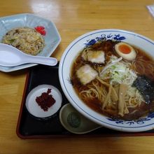 ラーメンは醤油を注文。これも昔ながらの素朴なスープで好感が持てます。味付け卵が載っているのもポイント。セットには辛みそがサービスで付けられるので、食べている途中で味付けを変えることもできます。