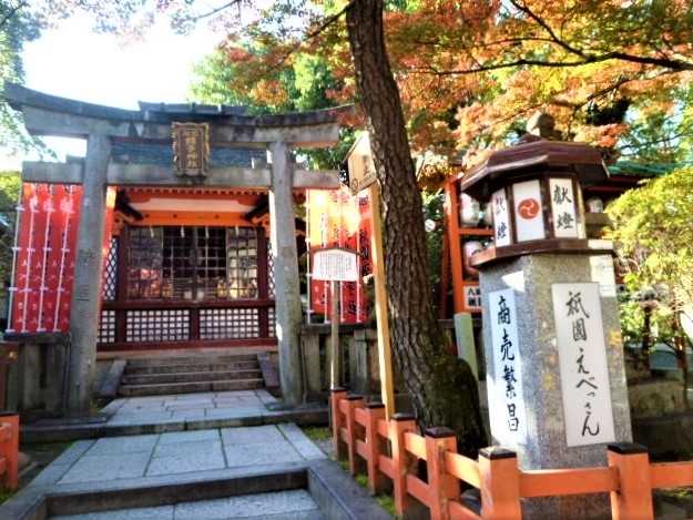 八坂神社で西楼門から境内に入り舞殿/本殿までいく途中に<社>がありますが、右側に[北向蛭子社]が。蛭子社は`えびすしゃ`ですが、鳥居の扁額にも`北向`がありました(^^!) `えびす`は恵比須さまで商売繁昌と地元の社`祇園えべっさん`で幟が立っていて沢山の氏子が♪