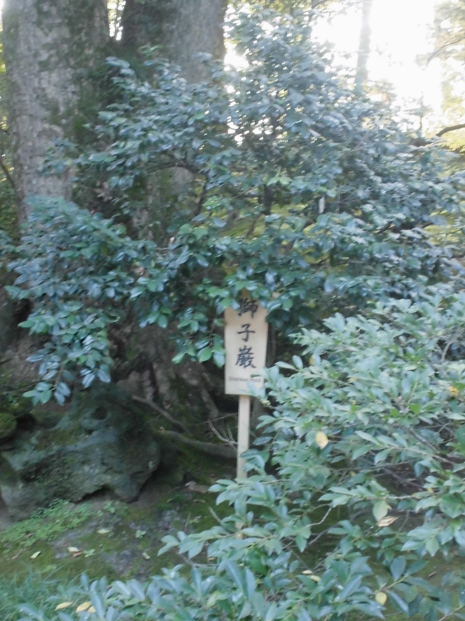 兼六園の三石といわれているそうです。ただ実際に見るとよくわかりませんでした。看板があってその近くと言うのはよくわかるのですが、木々に隠れてしまったのが残念です。むしろその後ろ側にあるコケがびっしり生えた風景の方が見ものです。